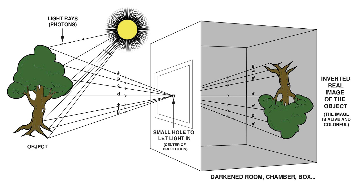 The moon and the sun, in astrology, also represent the eyes. Long ago, it was said that the right eye (sun) casts out rays of sight while the left eye (moon) receives them. Eclipses upend our expectations of how the sun and the moon are supposed to look… and act. However, even the way the human eye actually works is quite literally upside-down: our eyes are the original pinhole camera, or camera obscura.